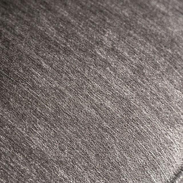 A sophisticated influence on a traditional design, the sloping flat-paneled arms recall the rigidity of Noir-era loveseat while a variety of pillow styles add a modern flavor. The gray refined linen fabric is accented by shiny nail-head trim that emphasizes the unique outline of the sofa and loveseat contours. This is luxury and then some, complete with a plush dynamic provided by a total of twelve pillows.