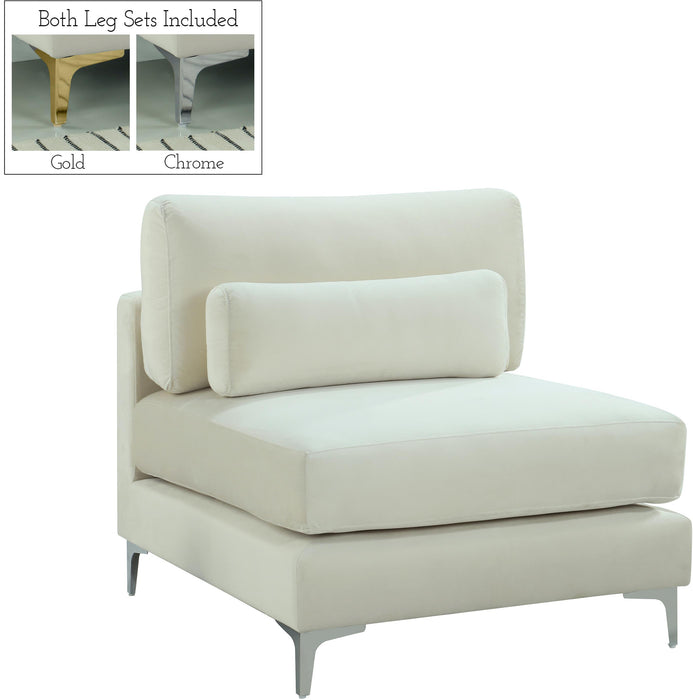 Ready to get cozy? Curl up from the welcoming confines of this Julia velvet modular armless chair and you can do just that! Its soft cream velvet upholstery is soft and supple to the skin, coaxing you to relax, unwind, and sit for a spell. It comes with both gold and chrome legs for a customizable and contemporary finish. Pair this Julia piece with others to form an infinite number of seating configurations to meet your particular decorative desires and space requirements.
