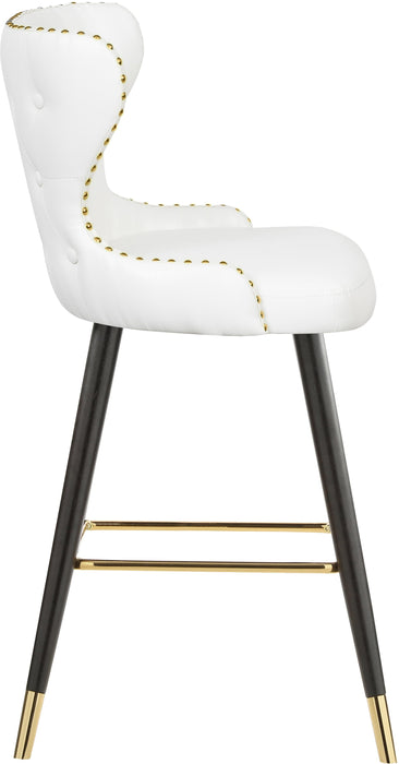 Sit comfortably and stylishly in this Hendrix faux leather bar and counter stool. This handsome stool features white faux leather upholstery on the seat and back, ensuring that you get a luxe and refined look without paying a lot. But don���t worry���no one will know that this buttery soft upholstery is not the genuine thing. The stool���s espresso wood legs and gold footrest with gold caps lends it a definitive contemporary punch.