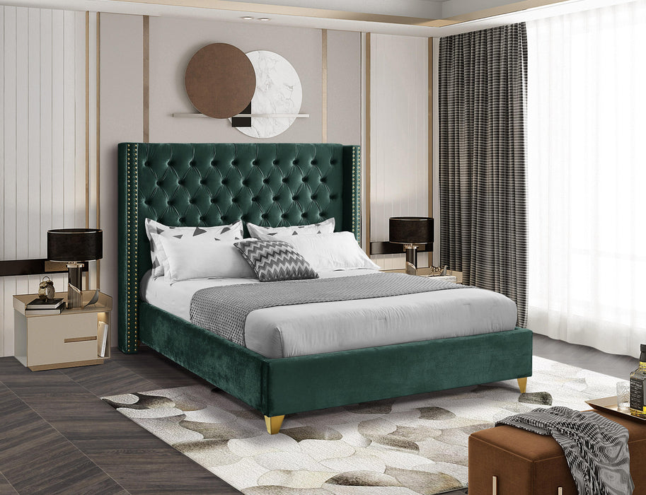 Elegant and eye-catching, the stunning Barolo Bed from Meridian Furniture is the perfect addition to any bedroom. Rich velvet covers the deep tufted design. A beautiful wing bed design is complimented by hand applied gold nail head details. Strength and beauty is guaranteed with a solid wood frame and stainless steel legs.