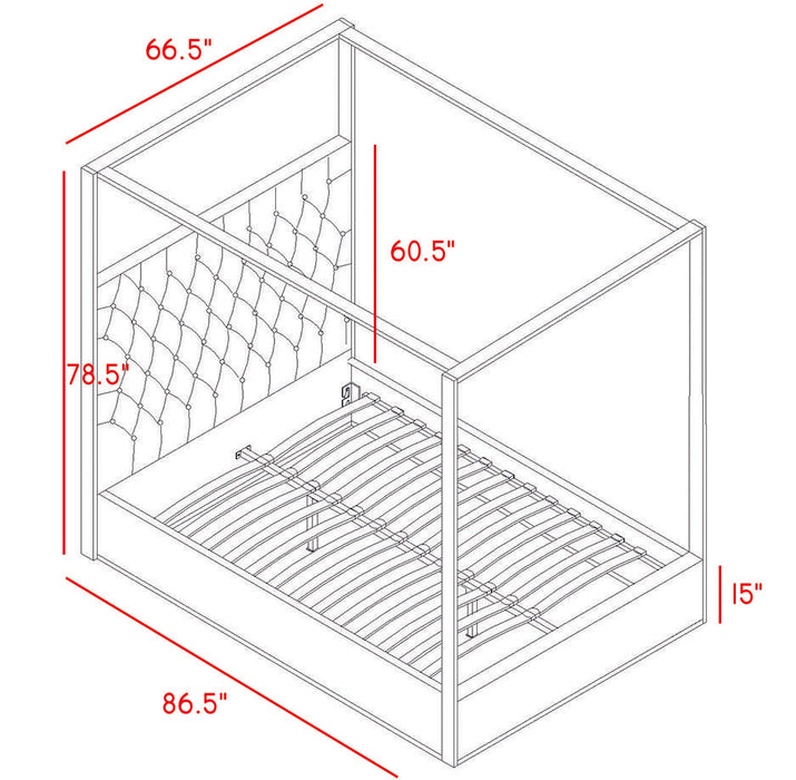 Dream big in the Porter navy velvet canopy bed. This handsome Meridian Furniture bed has a tufted headboard that stands a full 60 inches tall, giving the bed a regal and sophisticated look. The headboard is tufted for added elegance, and the bed comes with a chrome canopy, adding to its overall elegance and grandeur. Navy velvet fabric used on the sides and headboard gives it a luxe vibe, and the headboard is heavily padded, making it an ideal backrest for reading or watching TV.
