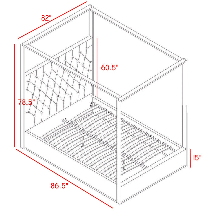 Dream big in the Porter navy velvet canopy bed. This handsome Meridian Furniture bed has a tufted headboard that stands a full 60 inches tall, giving the bed a regal and sophisticated look. The headboard is tufted for added elegance, and the bed comes with a chrome canopy, adding to its overall elegance and grandeur. Navy velvet fabric used on the sides and headboard gives it a luxe vibe, and the headboard is heavily padded, making it an ideal backrest for reading or watching TV.