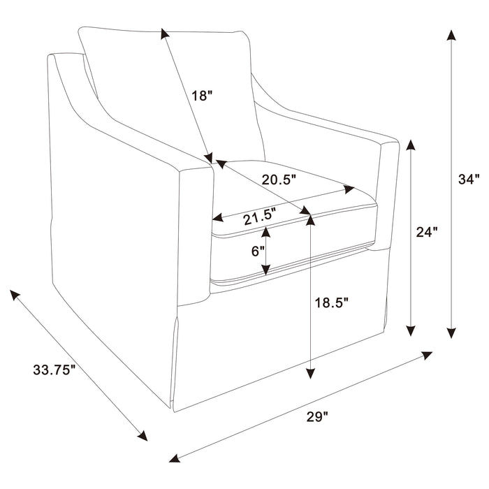 This swivel accent chair complements living room décor with its neutral fabric and streamlined silhouette. Perfect as lounge seating or an occasional chair, it offers a gentle, 360-degree swivel for relaxed conversation or quiet reading. Its plush seat and transitional flair enhance the comfort and style of your home, blending subtle elegance with everyday versatility.