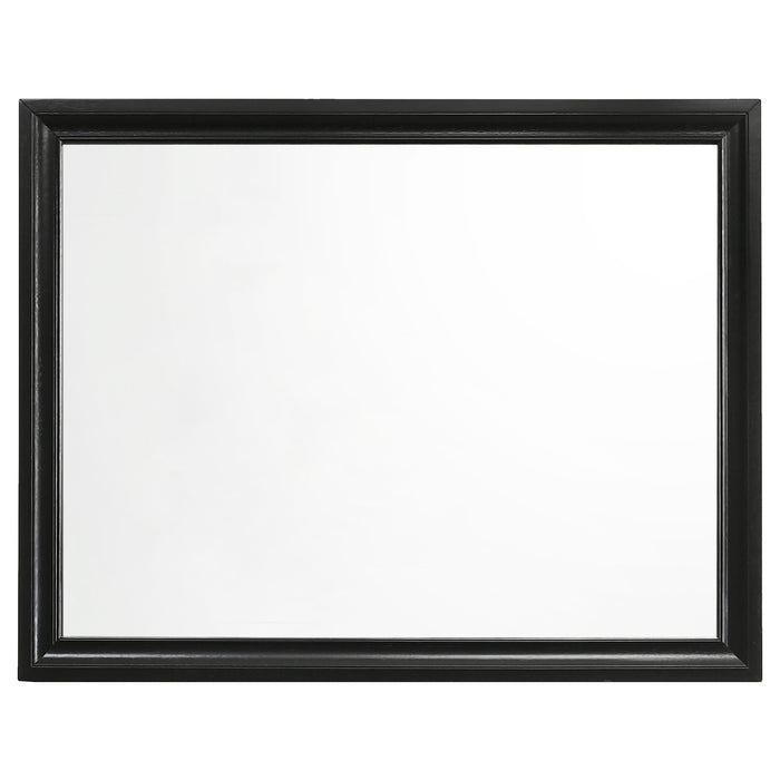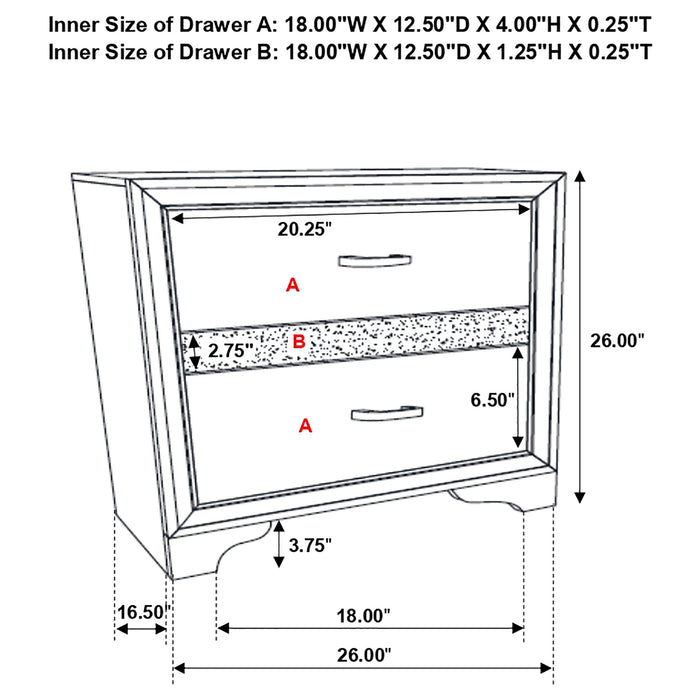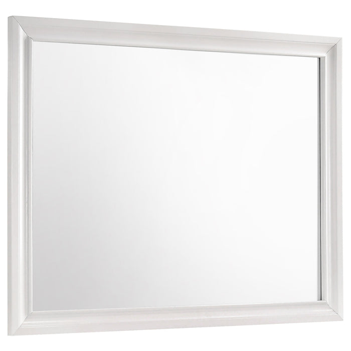 Encourage a glam vibe in your refined bedroom with a modern four-piece bedroom set. Centering on a stylish bed with an upholstered headboard and low footboard, the set includes a two-drawer nightstand for easy bedside storage and display space. A seven drawer dresser and mirror complete the set, adding diamond-like trim across its face that catches the light and offers a sophisticated touch. Bracket feet add a touch of dimensionality and movement to each piece and jewel-like bar pulls add intriguing sparkle. A cool white finish is textured, while white finish trim is smooth, creating a touch of textural contrast that add engaging style.