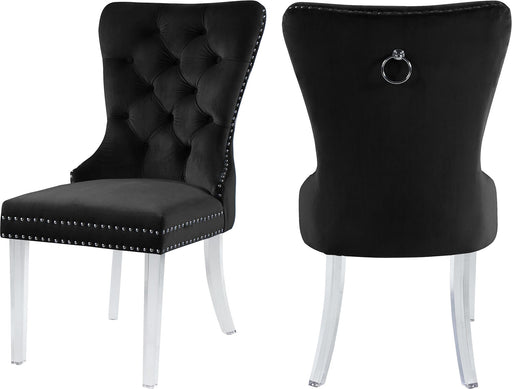 Dine in luxurious style with the Nikki black velvet dining chair. Featuring a curved high back, plush cushioned seat and deep tufted black velvet u...