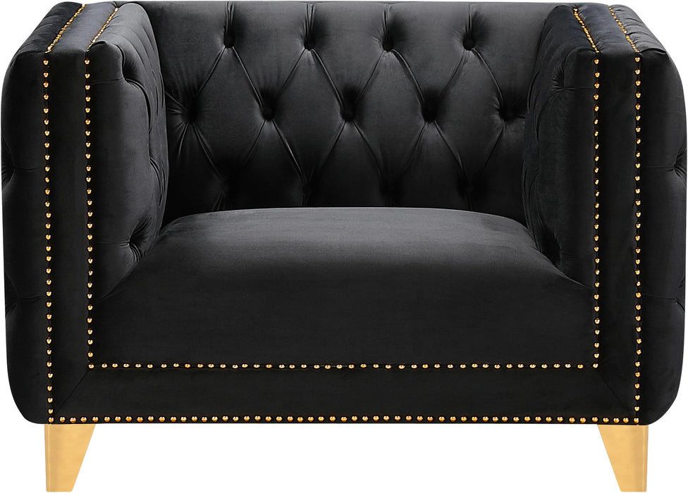 Upholstered in soft black velvet, this Michelle chair is sumptuously glamorous. Designed for upscale living, this chair features rich gold nail head trim and gold iron legs that keep it grounded in contemporary beauty. Tufted material covers every inch of this unit, and button tufting ensures that the unit stays plump and comfortable and holds up well to continual use. Pair it with other items in the collection for a cohesive look.