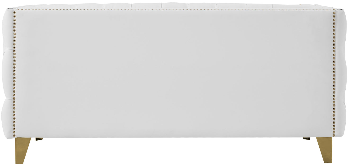 Upholstered in soft white faux leather, this Michelle love seat is sumptuously glamorous. Designed for upscale living, this chair features rich gold nail head trim and gold iron legs that keep it grounded in contemporary beauty. Tufted material covers every inch of this unit, and button tufting ensures that the unit stays plump and comfortable and holds up well to continual use. Pair it with other items in the collection for a cohesive look.