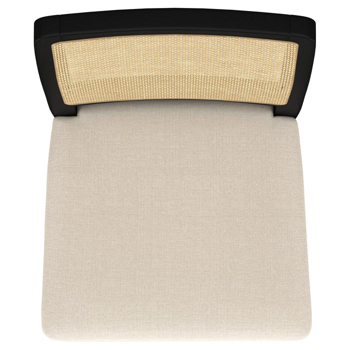 This dining chair combines modern comfort with organic charm, featuring a handwoven cane backrest crafted in Indonesia for a natural, textured appeal. The solid Asian hardwood frame provides durability and a warm aesthetic, while a beige linen-like upholstered cushion enhances its cozy style. Pirelli webbed seat construction ensures both comfort and lasting support. Reinforced with a sleek metal stretcher bar, this chair balances beauty and functionality.
