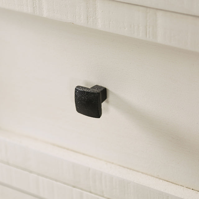 Simple but bold in stature, this inspired night stand is the epitome of farmhouse appeal. Each panel is hand-painted using non toxic water-based paint, and then rubbed off meticulously by hand for a beautiful distressed look. The construction is top-notch as well, as seen in the English dovetail drawers and heavy duty hinges. The black square knobs are a nice final touch. All these details come together for a solid wood night stand that's stylish and timeless.